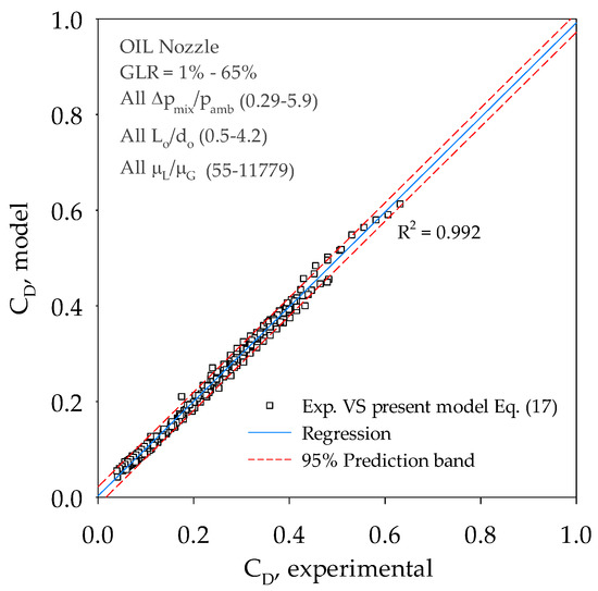 Comparison of the experimental and predicted CD from the present model in Equation (17) for the OIL nozzle.