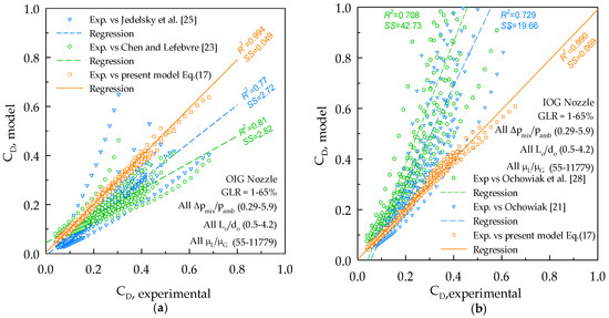 A comparison between the present model with the other models published for the OIG and IOG nozzles in Figure 14 shows that the CD predicted by the published models for both nozzles features a significant dispersion along the expected trend. This could be because of the neglection of some important factors in these equations, or because the ranges of the investigated factors are too narrow and inconsistent with present experiments (see Table 1), and/or because the effect of some factors is inconsistent with the findings of the present work. Note that the SFM (a = 0, b = 1) with polytropic expansion was selected during the calculations of Jedelsky’s model in Figure 14a.