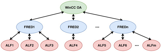 FRED is designed to work with multiple ALF servers, where the number of ALF servers is limited only by computational resources of machine and network bandwidth. This capability ensures that one instance of FRED can control a large amount of electronics of the detector. Furthermore, one WinCC OA system is able to manage multiple instances of FRED, making it possible to build large distributed control systems based on the ALFRED architecture, see Figure 4.