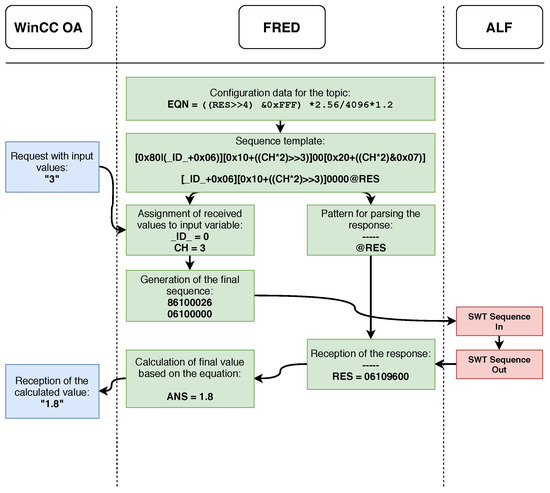 After reception of a request from WinCC OA, FRED generates the resulting command sequence for the detector electronics. FRED supports three basic sequence types: SCA, SWT, and IC. The SCA transactions are used to control the SCA chip on the readout electronics. The SWT transactions are specific for some detectors, like the ITS or MFT (Muon Forward Tracker). The IC transactions are equivalent to the SCA, but use a different communication protocol. The basic principle of sequence generation is to use a predefined sequence template into which the required information is parsed (usually information obtained from a WinCC OA request or information obtained from a configuration database). Parsed information can still be pre-processed using defined functions, the same that are available when translating real physical quantities into raw data. The generated sequence is then sent to the desired ALF corresponding to the specific detector electronics, and FRED then waits for the response to be received.
