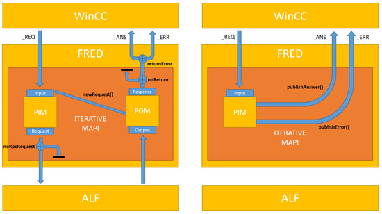 If there is no need or possibility to generate a sequence for the electronics based on the received request, it is possible to switch the iMAPI to the mode shown in the right part of the figure using the noRpcRequest flag. In this mode, it is possible to generate an answer or error message in the PIM block even without communicating with the electronics, and then send that to WinCC OA as a response. This mode is mainly used when it is necessary to dynamically change the required FRED settings that are not directly related to electronics.
