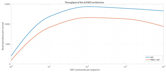 Figure 7 shows the results of tests of the ALFRED system throughput. As can be seen, the throughput of the system increases with the increasing number of commands in a single sequence, due to the diminishing influence of the DIM overhead, as the sequence is always sent as a whole by the DIM protocol. Maximum system throughput is achieved if the sequence contains approximately 100 commands, where ~14,400 register readings per second can be achieved using the ALF server and ~12,000 register readings per second can be achieved using the FRED server together with the ALF server. As the number of commands in a given sequence increase, the throughput decreases slightly as the time to process the larger sequence increases.