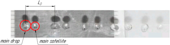 Experimental research shows that jet decay occurs at the frequency of 240 Hz (Figure 2). In this case, the main droplet forms with a satellite. The average diameter of the satellite ds0 = 0.92 mm is not significantly different from the average diameter of the droplet d0 = 1.04 mm. At the beginning of this movement, the distance between the groups of droplets L0 = 3.8 mm.