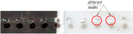 Similarly, for the vibration frequency of f = 510 Hz (Figure 3), diameters of the main droplet and the satellite are equal d = 0.94 mm and ds = 0.84 mm, respectively. In this case, the range 0.78–0.84 mm of the satellite diameter allows evaluating the average value of 0.81 mm. Finally, it should be noted that the relative error is less than 4%.
