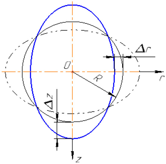 To identify kinematic characteristics of droplet oscillations as the periodic change of its shape from spherical to ellipsoidal with an alternate change of its axes in radial cross-section, as has been experimentally studied (Figure 3), the condition of droplet mass conservation can be applied for deformations according to the design scheme presented in Figure 5: