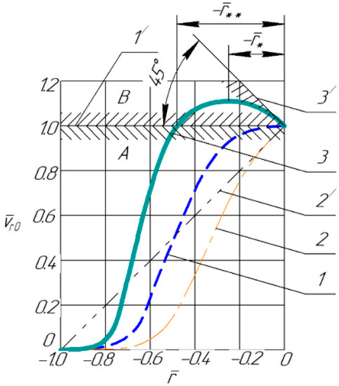 Changing the radial velocity amplitude over the radius of the droplet: A, B—zone of the constant and variable sign of the radial velocity gradient; 1–3—curves of the radial velocity amplitude; 1/–3/—tangential lines to the radial velocity at the droplet surface.