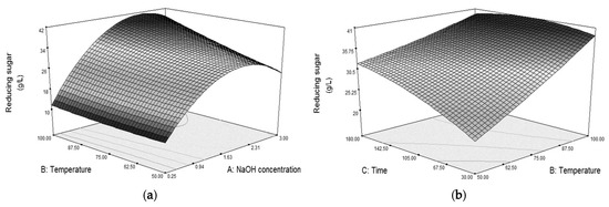 The analysis of variance (ANOVA) for the model (Table 3, NaOH) indicated that all the factors had a significant effect on the susceptibility of the grass to cellulase hydrolysis. In addition, interactions between NaOH concentration and temperature (A, B) and between temperature and time (B, C) also had significant effects as demonstrated in Figure 1. The plots indicate that an increase in the concentration of NaOH resulted in an increase in reducing sugar obtained from the susceptibility test until the concentration was approximately 2 M; then the sugar started to decrease. Furthermore, the time taken in pretreatment has shown its dependence on the temperature used (Figure 1b). At low pretreatment temperature, the grass was more susceptible to cellulase hydrolysis with longer treatment time whereas time had little effect at high treatment temperature.