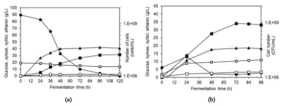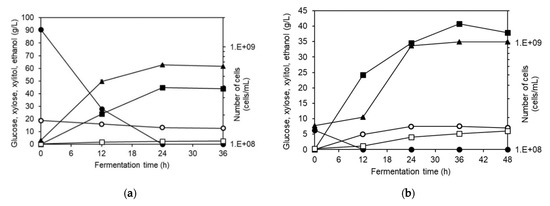 Figure 5. Fermentation profiles of S. cerevisiae TISTR 5339 when cultivated in (a) liquid hydrolysate of NaOH-pretreated Napier grass using SHF and (b) NaOH-pretreated grass using SSF. Symbols: ●—glucose; ○—xylose; ■—ethanol; □—xylitol and ▲—cell number.