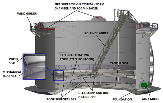 - PetroWiki. Floating Roof Tanks. Available online: https://petrowiki.org/Floating_roof_tanks (accessed on 4 March 2020).