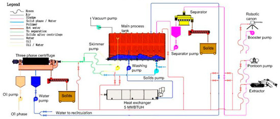 The separation module [32] operates simultaneously with the recirculation module. This module makes the final separation of the sludge according to the requirements of the tank owner. The mud can be separated into oil, water and solid residues, thus recovering almost 100% of the hydrocarbons present in it. The procedure is as follows: The separation module is powered by the recirculation module and the sludge initially passes through a shell and tube heat exchanger, which increases its temperature. It is then transferred to a two-phase decanter, where the solid residues are separated by the liquids. Solid waste is stored in containers for further treatment if required or disposed of directly to the environment if there are no restrictions by state regulations. The water–oil mixture passes through a second heat exchanger to result in a high-speed oil/water separator, where the final separation between oil and water takes place. The water is sent to the wastewater treatment facility while the oil is delivered to the owner as recovered oil to be sold or used in another process. At this point, there is no sludge left in the tank but only a thin layer of oil on the bottom and walls.