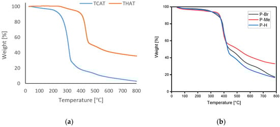 Thermogravimetric Analysis (TGA) degradation curves for (a) TCAT, THAT; (b) TBAT (p-Br), TAT (p-H), TMAT (p-MeO) derivatives.