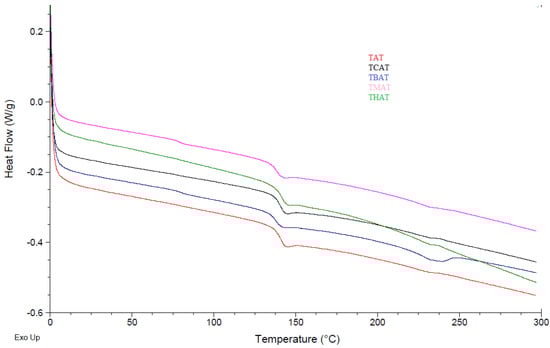 The results summarized in Table 2 and shown in Figure 3, reveals that the Tg of the tested compounds 3a–e were in the range of 140–145 °C and are slightly similar to each other.