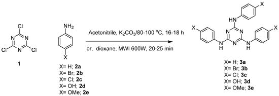 Cyanuric chloride 1 (10 mmol) in 25 mL dioxane was slowly added to a mixture of aniline derivatives 2a–e (30 mmol) and K2CO3 (30 mmol) in 20 dioxane at 0 °C. After complete addition, the reaction mixture was stirred at room temperature for 20 min and then irradiated in a microwave oven at 600 W for 20–25 min using a Galanz microwave oven, connected with a refluxing condenser. The solvent was removed under reduced pressure and the solid obtained was washed with water, dried, and then recrystallized to afford the pure product.