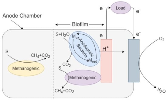 In this model, Monod kinetics is used to represent the growth rate of both the microorganisms. Moreover, the anodophilic microorganism’s growth rate significantly relies on the substrate concentration and mediator, whereas the growth rate of methanogenic microorganism is only dependent on the substrate concentration. The comprehensive modeling of single-chamber MFC with two microorganisms is presented in [39].