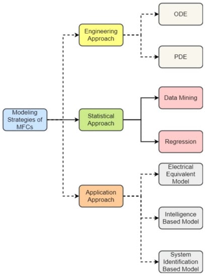 Mathematical model of any system transforms the compound system operations into facile mathematics representing dynamical equations. A mathematical model of the MFC system incorporates the impact of parameters such as design (i.e., membrane and electrode materials, type and volume of chambers, etc.), operational (i.e., number of populations and source of microorganisms, electron transfer mechanisms, etc.), and biological parameters (temperature, pH, resistances, flow rate, etc.) on the system output [33,34]. There are several ways to develop a mathematical model of MFC by considering different factors. For instance, based on the culture of the microorganism accounted for in the model development, either it can be a pure culture with one or two microorganisms or mixed culture with multiple types of microorganisms or based on the way of transportation of extracellular electron considered in the model, either it can be direct transfer or indirect transfer, or whether biofilm is considered or not [35,36]. Apart from these factors, mathematical modeling of the MFCs is done in either engineering or statistical approaches as shown in Figure 2.