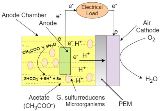 Abul et al. proposed a single-chamber MFC model with pure microorganism culture. The principal operation of MFC can be illuminated by Figure 3. It illustrates the chemical reaction process and also shows the types of substrate and microorganism used in the modeling process. In this model, some reasonable assumption has been taken [38].