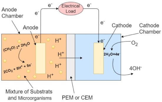 Zeng et al. proposed a dual-chamber MFC model with a pure culture of microorganism [41]. The principal operation of dual-chambered MFC can be illuminated by Figure 4.