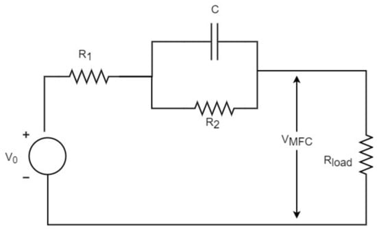 In this approach, performance characteristics and dynamical behavior of MFC are described by electrical parameters such as voltage, resistance, current, and capacitance. Thus, the voltage and current of the electrical circuit model are referred to as the biological and electrochemical reactions in MFCs. A simple equivalent electrical circuit of MFC shown in Figure 5 is proposed by [56]. In this model, and are the internal resistances. C and are the internal capacitance and external load of MFC, respectively.