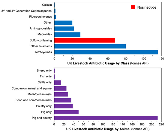 Sales of livestock antibiotics for by antibiotic class (top) and animal type (bottom) [11].
