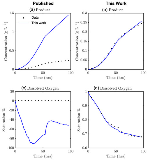 Modeled vs. experimental product concentrations from (a) published model [39,40] and (b) this work and dissolved oxygen concentrations from (c) published model [39,40] and (d) this work.