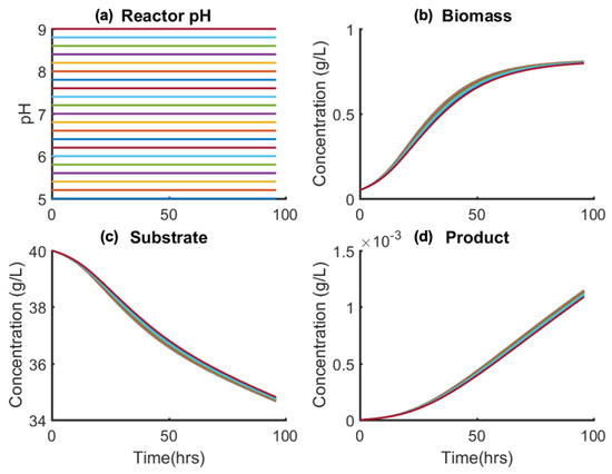 To elucidate the sensitivity of the model states on manipulated controls (F, T, pH), a sensitivity analysis was performed. Figure 7 shows the effect of varying constant reactor pH on state profiles, showing negligible variation over the applicable pH(t) = 6–8 (Equation (28)); this is due to the pH-dependent model term (Equation (2)) varying weakly vs. pH for the given model parameters (K1 and K2). Similarly, the sensitivity of states vs. isothermal reactor temperature (T(t) = 26–32 °C) is compared in Figure 8. The variation in states vs. temperature is also negligible due to biomass cell growth and death (numerators of first terms in Equations (2) and (3), respectively,) varying weakly vs. temperature within the applicable range. The model dependence of both temperature and pH is as presented in the literature [39,40].