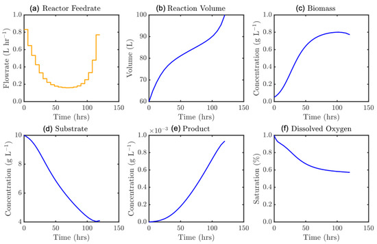 Observing the attained product concentrations vs. biomass at the end of the batch duration shows that the highest productivities are attained from intermediate biomass values, not necessarily from the highest. It is also observed that many of the considered feedrate profiles achieve comparably low productivities for their given biomass present, highlighting the need for process optimization. Resulting broth volumes are also highest at the low to intermediate range of biomass concentrations; it should be noted that the model assumes that biomass growth does not affect broth volume, i.e., that the system is relatively dilute. For adaptation to systems with higher biomass loading, Equation (7) should contain a term that describes volumetric changes due to biomass growth.