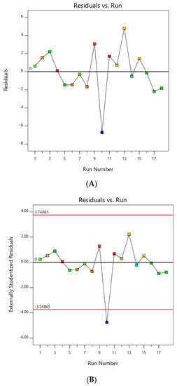 The RSM model generated was first checked by examining the residuals plot and external studentized residuals plot, as shown in Figure 1A,B, respectively. Residuals showed the difference between actual and predicted response values [35]. Assuming the model holds, external studentized residual was used to check whether a run was consistent with other runs, whereas the model coefficients were calculated based on all design points except one and a prediction of the response at this point was made, where any value greater than the calculated standard error, usually between absolute value of 3 and 4, meant that this point should be examined as a possible outlier [35].