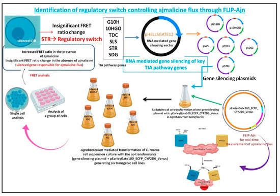 The present study undertakes the task of contributing better understanding of the metabolic regulation of the ajmalicine synthesis by identifying the regulatory gene controlling the ajmalicine flux through the FRET-based nanosensor for ajmalicine (FLIP-Ajn). The FLIP-Ajn was developed in our previous study [24]. An overview of the strategy involved in identification of the regulatory switch through FLIP-Ajn is given in Figure 1.
