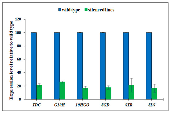 Real-time reverse transcriptase PCR of the mRNA translating tryptophan decarboxylase (TDC), geraniol 10-hydroxylase (G10H), 10-hydroxygeraniol (10HGO), strictosidine β-glucosidase (SDG), strictosidine synthase (STR) and secologanin synthase (SLS). Levels of the silenced lines are normalized to 100% in the wild type line. The gene expression level of the silenced lines relative to the wild type is represented here. Values are mean of three independent replicates. Vertical bars show the standard deviation.