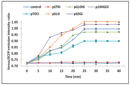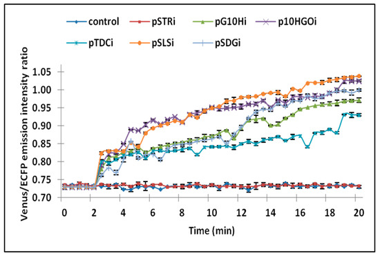 Confocal microscopy analysis, representing increased FRET ratio after 2.5 min in the elicited single cells harbouring pG10Hi, p10HGOi, pTDCi, pSLSi, and pSDGi. No significant FRET ratio change was seen in pSTRi-containing cell. Values are mean of three independent replicates. Vertical bars represent the standard error.