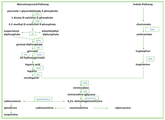 The biosynthesis of terpenoid indole alkaloids in Catharanthus roseus follows an intricate pathway, comprising a highly compartmentalized system. The metabolic pathway genes have been previously characterized and the function was elucidated. Geraniol 10-hydroxylase encoded by G10H is a cytochrome P450 monooxygenase (CYP76B6) enzyme and involves oxidation of geraniol to 10-hydroxygeraniol [32]. The 10-hydroxygeraniol oxidoreductase encoded by 10HGO catalyzes the oxidation of 10-hydroxygeraniol to produce aldehyde 10-oxogeraniol [33,34,35,36]. Later, in the pathway secologanin synthase (SLS) catalyzes the production of iridoid secologanin [37]. The tryptophan decarboxylase (TDC), a pyridoxal phosphate-dependent enzyme of the indole pathway, decarboxylates tryptophan and produces tryptamine. This is believed to be the connecting link between primary and secondary metabolism [38]. Further, the central monoterpenoid indole alkaloid (MIA) precursor, strictosidine, is formed by the catalysis of strictosidine synthase (STR) [39]. In the following step, strictosidine is deglycosylated to produce a series of intermediates, including strictosidine aglycone, catalyzed by the enzyme strictosidine β-glucosidase (SDG). The steps further lead to the formation of various monoterpenoid indole alkaloids including ajmalicine [40]. An overview of ajmalicine biosynthesis is given in Figure 5.