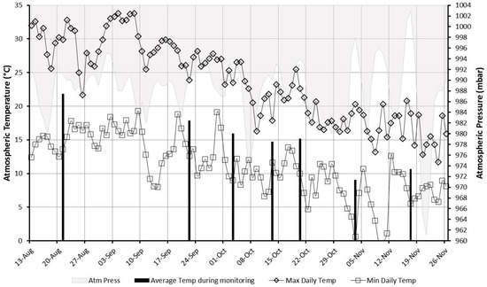 Figure 1 shows the daily atmospheric temperatures and the atmospheric pressure logged during the monitoring period, and the average atmospheric temperature in each monitoring day. Data showed the seasonal decreasing of the atmospheric temperature during the trial (from 22 to 9 °C) and the fluctuation of the atmospheric pressure.