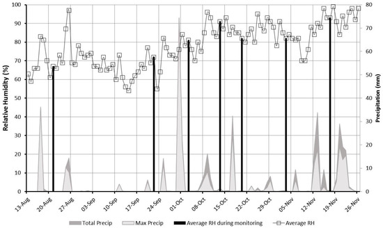 Figure 2 shows the relative humidity and the daily rainfall logged. As expected, precipitation was frequent and intensified in autumn months with the overall increasing of the relative humidity.