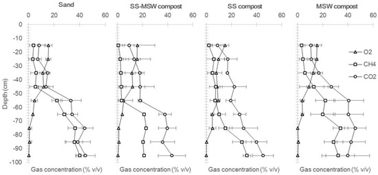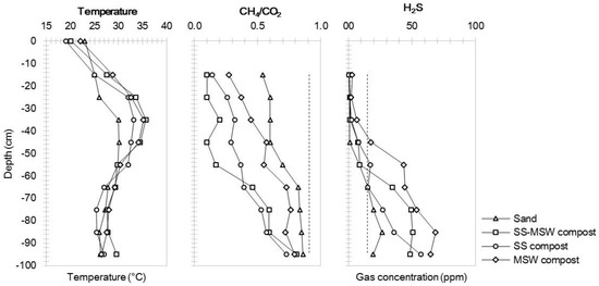 It is important to notice that the concentrations of hydrogen sulfide measured at 95 cm depth were found to be different among the covers; in particular, an average concentration of 19 ppm was measured in the sand cover, 48 ppm in the mixed SS-MSW compost cover, 57 ppm in SS compost and 64 ppm in the MSW compost covers. This allows one to observe the effect of H2S mitigation in biocovers, as other authors have found [17,19,34].