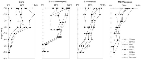 Starting from every over gas concentration profiles, the oxidation efficiencies were calculated for each cover according to Gebert et al. (2011) [14] (Figure 5). The results underlined that in each plot, the efficiency decreased with depth, indicating that the presence of oxygen in the cover allowed for the development of methanotrophic bacteria. Data showed that high efficiency was achieved in the last monitoring days, probably due to a better acclimatization of methanotrophs. However, the worst performances were observed on November 17, when high values of water content were measured in the cover as a result of heavy rainfall. The average total efficiency (corresponding to 15 cm depth) of the mixed SS-MSW compost cover was registered to be the highest (75%), followed by the efficiencies of SS and MSW compost plots (65% and 56% respectively). The maximum oxidation efficiencies were 100% in the SS-MSW compost plot, 96% in the SS compost and 81% in the MSW compost.