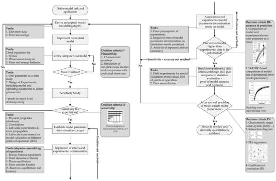 Other models, which are verified and validated with this process model development workflow, summarised schematically in Figure 3, cover a solid–liquid (phyto-) extraction [12], upstream fermentation [15], liquid–liquid extraction [16], continuous single-pass tangential flow filtration [17], precipitation [18] and chromatography [19]. This demonstrates the benefit of a methodical approach to model development.