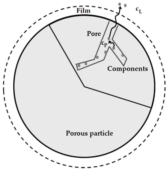 The pore diffusion model is used to describe the diffusion of the oil from the particle. It was originally developed for chromatography and is an extension of the diffusion model used in the literature. The expansion includes, as shown in Figure 7, the consideration of the plant particle porosity. Therefore, the pore diffusion model has a higher level of detail [12,27].