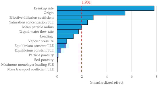 For the diffusion of the components through the water layer, as for the pore diffusion model, the second Fick’s law for the spherical shell (Equation (6)) is used again. In the equation, is the binary diffusion coefficient of the components in water.