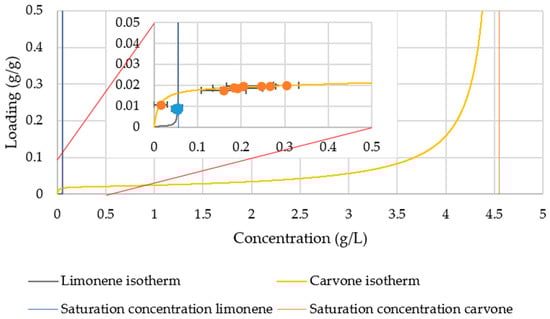 To determine the solid–liquid isotherms, caraway and lavender were placed in a 50 mL centrifuge vial and mixed with water. The samples were then brought to 99 °C in the thermal shaker. After equilibrium was reached, a sample was taken from the water phase and analysed. For caraway, 0.06 g, 1 g, 1.75 g, 1 g, 1.75 g, 3 g, 3 g and 3 g were mixed with 42 g, 25 g, 25 g, 15 g, 15 g, 25 g, 15 g and 15 g water. For lavender, 0.04 g, 0.75 g, 1.78 g, 2 g, 2.5 g and 3 g were mixed with 45 g, 41 g, 37 g, 33 g, 30 g and 33 g water.
