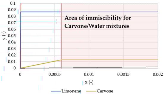 The surface area of the water phase is calculated using the surface area of the plant particle. The surface area of the essential oil is subtracted from the total area. The equilibrium concentration in the gas phase is calculated for both phases separately. The equilibrium concentration of free oil is based on Raoult’s law (Equation (11)).