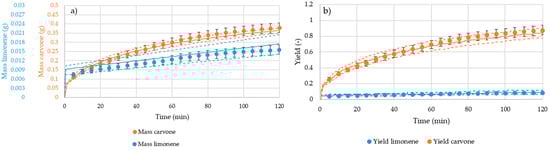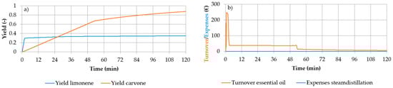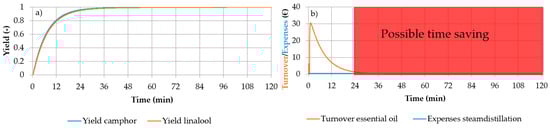 Water and steam distillation have been in use for a long time to extract the essential oil of plants. One reason for this is that there are no impurities, such as organic solvents, in the essential oil. In comparison with advanced basic operations such as extraction with supercritical fluids, distillation is easier and cheaper [1,2]. In addition to these advantages, the admission to use essential oils in medicine is connected to steam or hydro distillation as a production method [3,4]. Detailed literature searching for better process comprehension is rare, and recently green extraction approaches have gained attention and also acceptance [5,6].