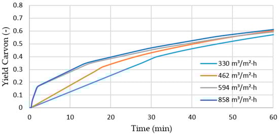 The Langmuir isotherm was expanded in 1938 by Brunauer, Emmett and Teller in the event of an existing saturation concentration of the target component in the liquid phase. The expanded isotherm is similar to the Langmuir isotherm for small concentrations, since only one layer is formed on the adsorption surface. When the concentration in the liquid approaches the saturation concentration, an infinite number of layers is formed. The modified isotherm is shown in Equation (5) [31].