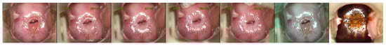 Dataset sample: the first five images correspond to the application of the acetic acid solution; the image from the penultimate column is viewed through a green lens; and the image in the last column displays the application of iodine solution. The sample corresponds to Class 2 (Cervical Intraepithelial Neoplasia 2/3). In the images, it can be observed how the area below the cervix opening turns whiter after the application of the acetic acid solution.