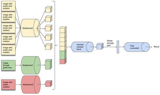 The main contribution of this study is the creation of the MobileNetV2 ensemble and the tuning of the MobileNetV2 architecture to be better used in the context of the ensemble. As described in Section 3.1, the dataset could be split according to three categories: images after applying the acetic acid solution, images viewed through a green lens, and images after applying the iodine solution. In Section 4.2, we will show that training a single MobileNetV2 model on a single category of images yields better results than training on all of the categories at the same time. Based on this observation, we trained a separate model on each of the image categories. In the final step, we joined the trained models in an ensemble that yielded superior results to any of the separately trained models. We used the model described in Section 3.2.2 as the building block of our ensemble. We trained three models of this kind on the three categories of images. Each model was trained in isolation on its specific image category, and the model parameters remained fixed when the ensemble was trained. From each of the three models, we dropped the last inference layer and the average pooling, the restricted size convolution becoming the output layer. All of the feature maps resulting from the three networks were stacked and then processed by an inverted residual block that analyzed and related all images at the same time. Finally, the feature maps went through global average pooling and through a fully connected layer that calculated the result.
