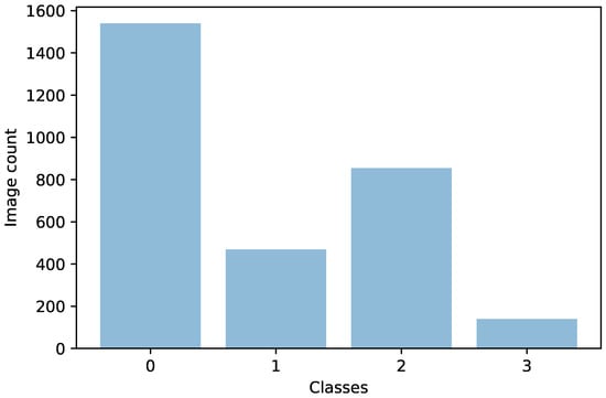 The training data contain 51.28%, 15.61%, 28.43%, and 4.66% samples of each class, corresponding to 1540, 469, 854, and 140 images.