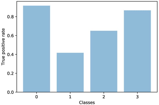 We chose a very simplistic metric, the true positive rate, which is also known as recall. Averaged across the four classes, this metric would not be descriptive enough to study the effects of class imbalance. However, if calculated separately for each class, then it enabled us to detect if the model became biased in recognizing certain classes to the detriment of others due to the training population structure. The per-class true positive rate was given by the percentage of true positives in the population having as ground truth that class; that is, we divided the true positives by true positives plus false negatives with respect to a certain class. We calculated the true positive rate by investigating the confusion matrix for the validation set. Given a confusion matrix M, the element counts the elements labeled with class i, but predicted as class j. Equation (4) presents a confusion matrix; the diagonal bold elements are true positives, and the rest are misclassifications. Each row of the matrix presents the population belonging to a certain class. Equation (5) shows the formula for calculating the true positive rate for class i. Given that the true positive rates were expressed as percentages, the measurements were agnostic of the number of elements contained in each class.