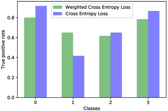 Because of the dataset imbalance, the trained model might be biased to better recognize certain classes to the detriment of others. This happens because during training, the model is exposed to an uneven number of samples from the different classes; therefore, the model parameters are more updated in a certain direction. To counter this phenomenon, we made the model focus more on the detrimental classes during training. This could be achieved by manipulating the loss function. By default, we trained the model using the cross entropy loss, shown in Equation (6). The weighted cross entropy loss, depicted in Equation (7), uses a weight vector to put more importance on some of the classes. In the focal loss [41], the easier examples are decayed using a factor , as shown in Equation (8).