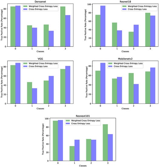 Per-class true positive rate comparison between models trained with cross entropy and with weighted cross entropy. Each plot displays the result for a different model. These plots are a visualization of the data from Table 9, and the same training procedures and models are used.