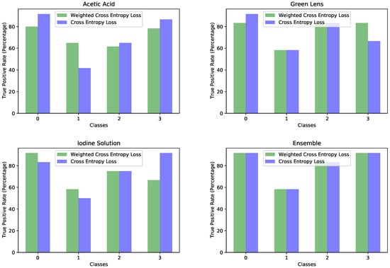 As a next step, we applied this training method to the rest of the images involving the green lens and the iodine solution and finally to the ensemble as a whole. This method proved beneficial for the images with an acetic acid solution and those through the green lens. In the case of those with an acetic acid solution, the overall accuracy did not change much, but the model was better balanced, while in the case of images through the green lens, both overall accuracy and class balance got better. Unfortunately, in the case of iodine solution images, the performance of the model degraded. For this reason, we decided to experiment with an ensemble formed from the models trained with weighted cross entropy for the images with acetic acid and through the green lens, but used the classical training procedure (simple cross entropy) for images with iodine solution. The ensemble convolutional network was trained with weighted cross entropy just like the other networks. We measured the overall accuracy and true positive rate per each class for this ensemble as we did for the single networks. At the same time, we did the same measurement for the ensemble trained classically. The results were surprising; both models displayed the same numbers for overall accuracy and true positive rate per each class. The ensemble made a much better use of the data available, taking advantage of both visual features and the relationships between multiple images. The ensemble adapted to the different image representations and provided the same outcome despite the differences in the image representations provided by the MobileNetV2 networks that were trained in different ways. In our opinion, this stability is an advantage. It can also mean that the image relationships might be more important than the individual image features in the overall performance of the system. Table 10 displays the results of this experiment. Figure 9 is a visualization of Table 10, each subplot displaying the comparison of the per-class true positive rates for the training on a certain type of image.