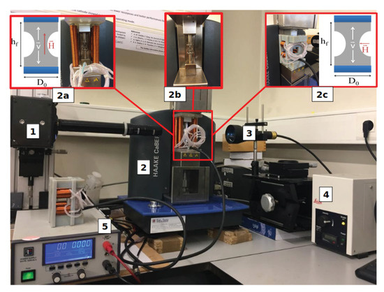 Experimental setup: (1) High-speed camera; (2) CaBER device: (2a) ExMRFx with parallel configuration, (2b) non-magnetic field, and (2c) ExMRFx with perpendicular configuration; (3) Telecentric Backlight Illuminator; (4) light source; (5) DC power source.